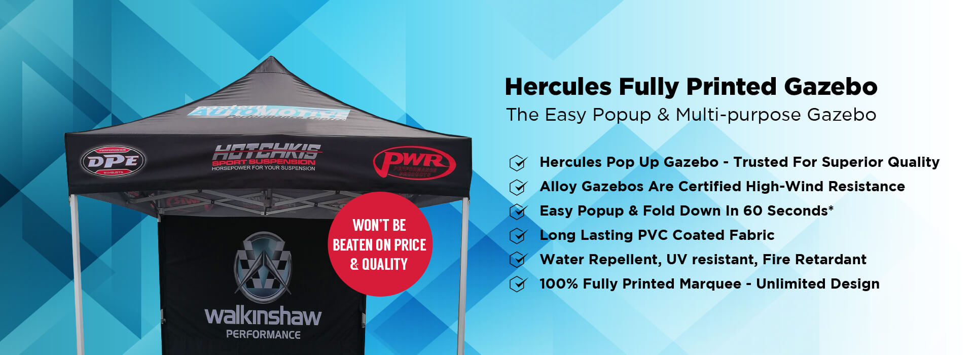 Stand out from the crowd with your personal branded gazebo. We work with you to create a unique gazebo display and print design, to suit your application and maximise your brand’s exposure.
